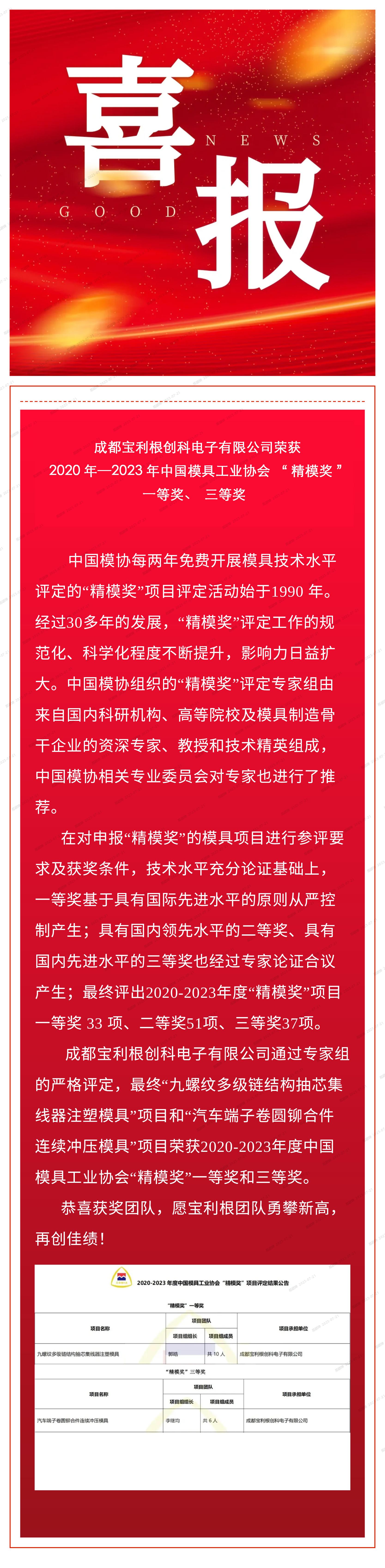 喜報——成都388vip太陽集團創科電子有限公司榮獲 2020年—2023年“精模獎”一等獎、三等獎