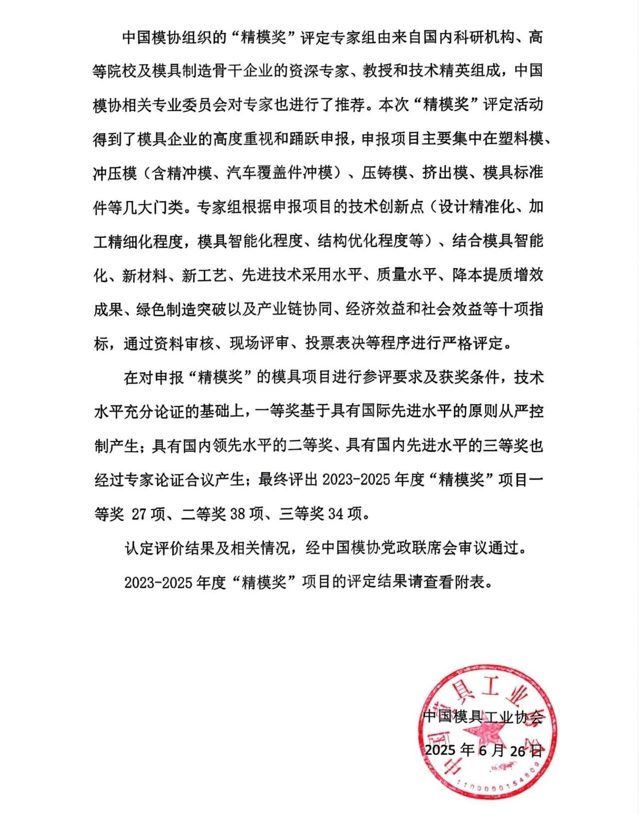 我司榮獲2023-2025年度中國模具工業(yè)協(xié)會(huì)“精模獎(jiǎng)”,其中有兩個(gè)一等獎(jiǎng),以及一個(gè)二等獎(jiǎng)。
